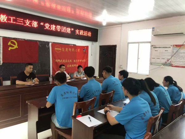 为深入学习贯彻习近平新时代中国特色社会主义思想,增强青年大学生的责任感和使命感,引导青年大学生在社会实践中受教育、长才干、做贡献,近日,best365官方网站登录入口教工第三党支部组织大学生志愿者团队前往太湖县西冲村开展“不忘初心跟党走 牢记使命勇担当”主题“党建带团建”暑期社会实践活动。