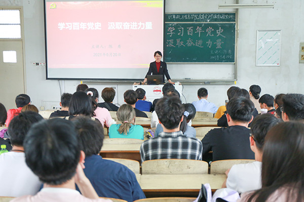 5月20日中午,best365官方网站登录入口党史学习教育宣讲会在稼先南楼一阶举行,学校党委宣传部常务副部长陈秀作了题为“学习百年党史,汲取奋进力量”的专题报告。宣讲会由学院党委书记陈银凤主持,副书记江晋剑、部分教师及全体学生骨干等近百余人聆听了报告。