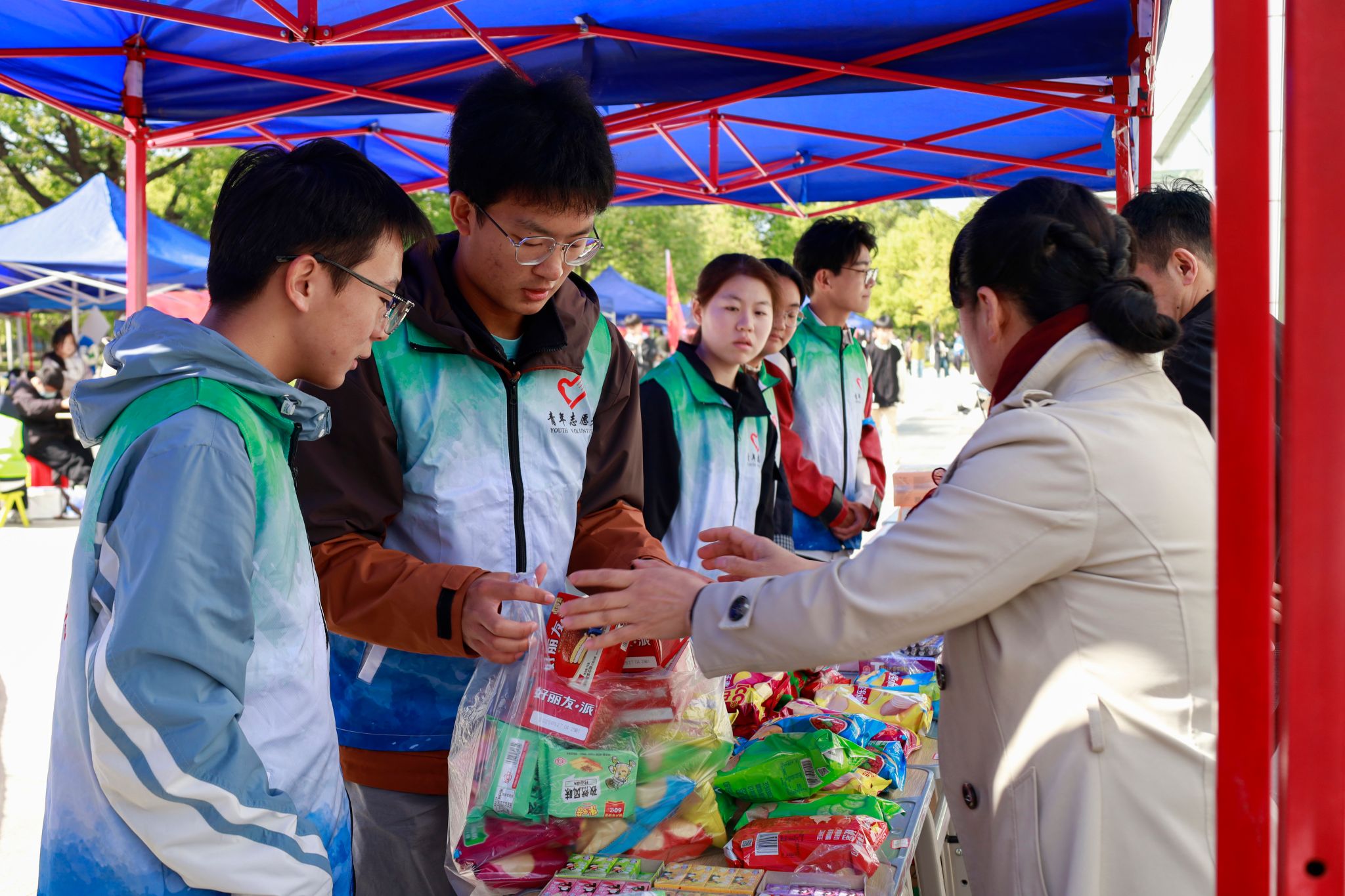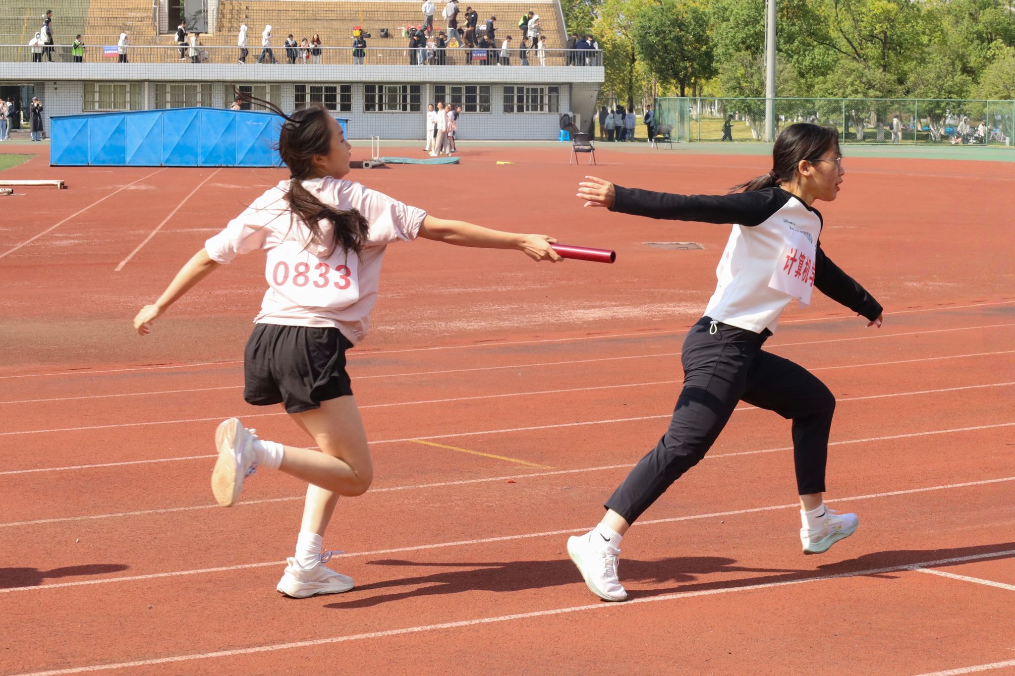 赛场内外,关怀与力量相伴。学院党委书记陈银凤、院长王远志、副书记肖之进来到比赛现场,与运动员、后勤志愿者亲切交谈,还特意从学校爱心超市购置食品为运动员补充能量。陈银凤、王远志等还到看台加入到啦啦队方阵中,组织同学们呐喊助威,一声声“计算机,加油”为运动员们注入强劲动力。“冲过终点线的那一刻,我特别激动!”张文娜作为大一新生,拿到两项个人冠军,面对领导的慰问,开心地说:“一开始只是想通过跑步锻炼身体,没想到能站上赛场。备战时再累,我也从没萌生过放弃的念头。800米的全力冲刺、1500米的咬牙坚持,都源于对初心的坚守。未来我会继续加油,为学院争光!”