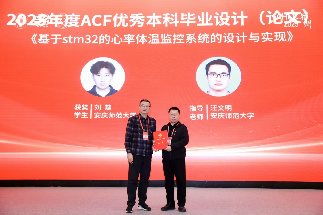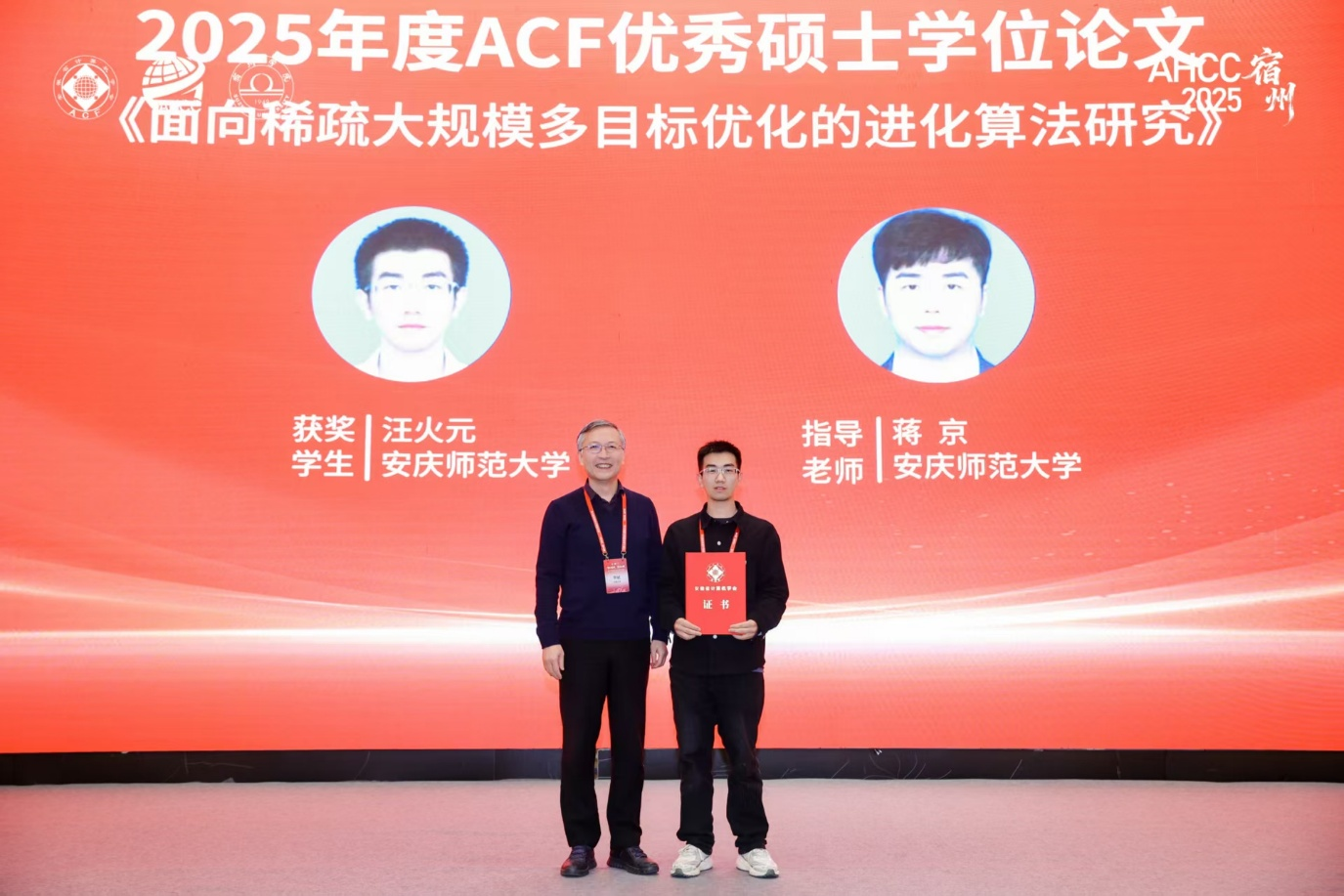 本届大会的优秀学位论文评选环节中,我院取得了喜人的成绩。蒋京副教授指导硕士生汪火元完成的《面向稀疏大规模多目标优化的进化算法研究》荣获“2025年度ACF优秀硕士学位论文”奖;汪文明副教授指导本科生刘燚完成的《基于STM32的心率体温监控系统的设计与实现》荣获“2025年度ACF优秀本科毕业设计(论文)”奖。上述荣誉充分体现了bat365官网在教学质量提升和人才培养方面的良好成效,进一步激发了师生在科研创新与实践探索中的积极性与创造力。