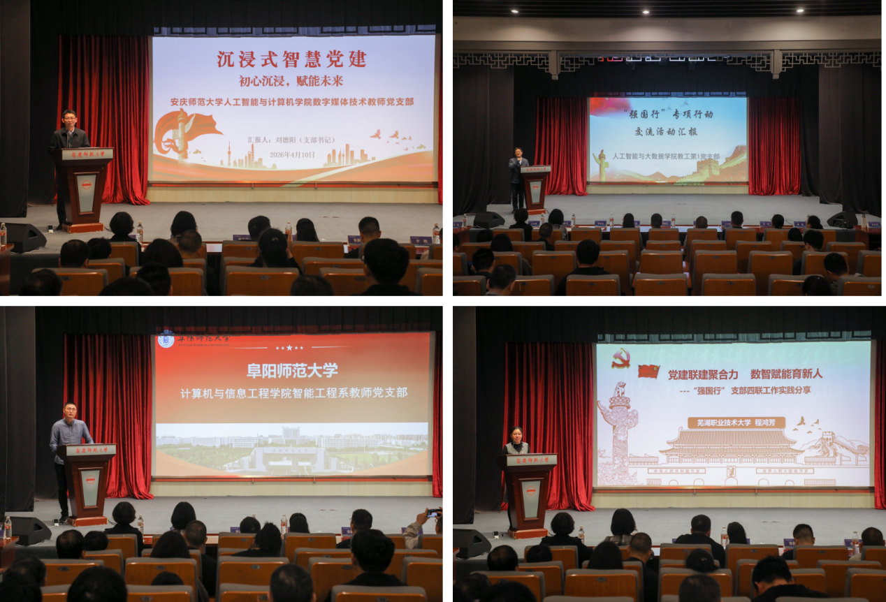 阜阳师范大学计算机与信息工程学院智能工程系教师党支部、合肥大学人工智能与大数据学院教工第一党支部、芜湖职业技术大学信息与人工智能学院教工第一党支部、学院数字媒体技术教师党支部等4个支部负责人依次发言,聚焦“双带头人”作用发挥、支部特色打造、党建业务深度融合等核心内容,全面展示各支部在党建联建、教育服务、科技赋能、实践育人中的特色做法与扎实成果。各成员单位代表紧扣“强国行”主题,围绕“双带头人”履职、支部品牌建设、党建业务“一融双高”等议题深入研讨、坦诚交流,现场氛围热烈,共同谋划2026年度小组工作计划与合作方向。