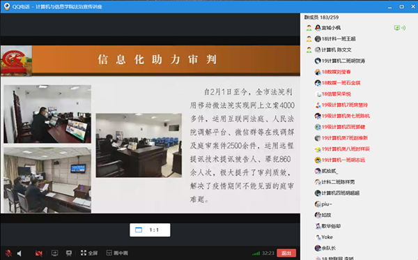 为了强化学生的法律意识,普及《中华人民共和国民法典》等法律知识,增强广大学生对信息化应用的认知以及依法保护自身合法权益的能力,6月30日下午,由学院教师第三党支部与院团委主办、敬敷女生工作坊协办的法制教育讲座通过QQ课堂在线举行,安庆市中级人民法院法官、bat365官网优秀校友金京应邀为学院300余名学生进行了普法宣讲,讲座由学院党委副书记江伟主持。