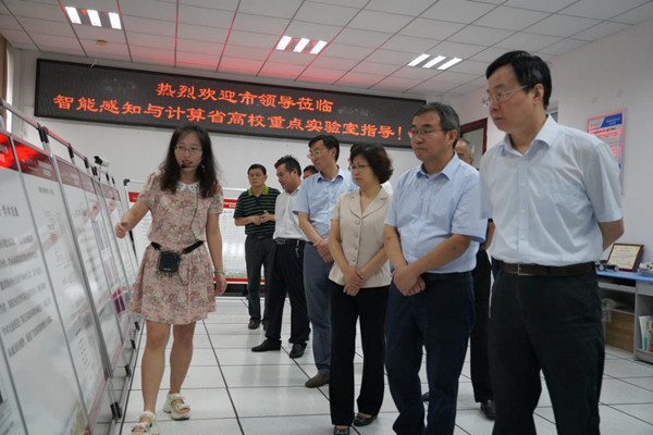调研组一行分别实地考察了智能感知与计算安徽省高校重点实验室和国家IT工程实践教育中心。重点实验室负责人从科学研究、人才培养、队伍建设、学术交流和社会服务等5个方面向市领导进行了展示汇报;工程中心负责人就中心的基本情况以及虚拟现实技术在黄梅戏数字化保护、江豚保护等方面的研究工作向市领导进行了介绍;考察期间市领导就感兴趣的技术领域与相关老师进行了现场交流。在随后的座谈会上,学院院长王一宾教授向与会领导汇报了人工智能产业学院工作进展情况。